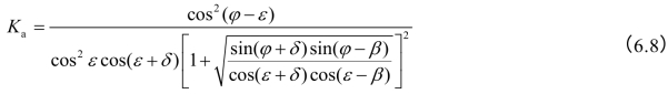 【解】∙根据ε=10°,β=20°,γ=18kN/m3,φ=30°,c=0和δ=(2/3)φ的条件,按式(6.8)可求得主动土压力系数Ka=0.540。