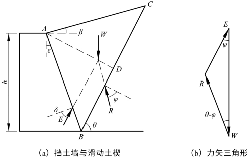 如图6.11(a)所示,设挡土墙高为h,墙背俯斜,与垂线的夹角为ε,墙后土体为无黏性土(c=0),土体表面与水平线夹角为β,墙背与土体的摩擦角为δ。挡土墙在土压力作用下将向远离主体的方向位移(平移或转动),最后土体处于极限平衡状态,墙后土体将形成一滑动土楔,其滑裂面为平面BC,滑裂面与水平面成θ 角。