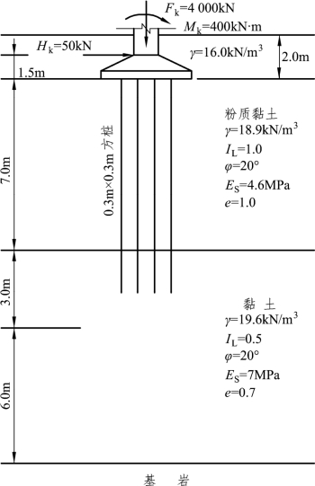 8.3 柱下桩基础断面如图8.31所示,承台底面埋深为2.0m,竖向荷载Fk=4000kN,单向力矩Mk=400kN∙m,水平荷载Hk=50kN,拟用预制钢筋混凝土方桩,截面积300 mm×300 mm,长10 m,试完成该桩基础的设计。