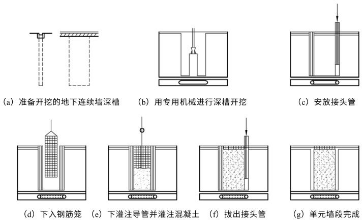 按挖槽方式大致可分为抓斗式、冲击式、回转式。由于成槽机械的不断改进,精度逐渐提高,目前地下连续墙的深度已达100 m。此外,在基坑深度比较浅的地方,已开始采用预制板地下连续墙。