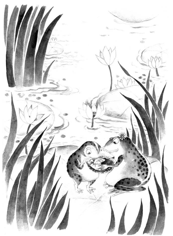 “不要这么大声说话,要不然会吵醒她的。”老癞蛤蟆说道,“她会从我们这里逃出去的,因为她轻得像天鹅羽绒一样。我们要把她放到河面上宽大的睡莲叶子上去。她这么娇小轻盈,那片睡莲叶子就像个小岛,她在那上面就跑不掉了。我们赶紧去把烂泥塘底下的新房打扫干净布置好,你们就在那里安家吧。”