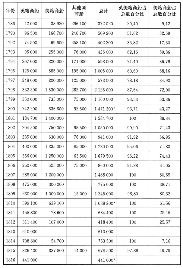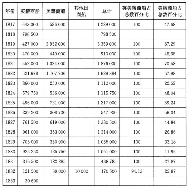 关于南京布的输出数量,严中平先生在其《中国棉织史稿》中已制成《广州对欧美海上贸易中的土布出口量》一表[63],列出了1800—1833年间英籍商船出口数、美籍商船出口数和出口总数,一定程度上揭示了其时南京布输向欧美的情形。但严先生的统计始自1800年,而未将有完整记录的1786—1799年的数据统计在内,年代稍少;又只采录英、美两国商船的记录,而未采其他国家商船的记录,因而出口总数大大缩小,其统计更以5年为1组计算平均数,但有些年份如1813、1816、1818和1833等年实际均无美国商船的输入记录,因此平均数实际上大大降低了实际出口数。因此,严先生的列表统计,并未确切显示其时南京布输出到欧美等国的基本情形和实际面貌。