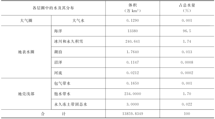 根据联合国教科文组织资料,不包括生物体中的水与矿物中的水,浅部层圈中水的总体积约为13.86×108km3。若将这些水均匀平铺在地球体表面,水深约为2718m。但其中咸水约占97.47%,淡水只占2.53%。各类水体的体积及比例见表1-1。