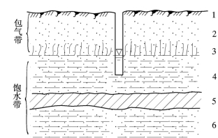 1—湿度不足带分布有气态水吸着水;2—湿度饱和带分布有气态水吸着水薄膜水;3—上升毛细水带;4—无压重力水带;5—粘土层;6—承压重力水带