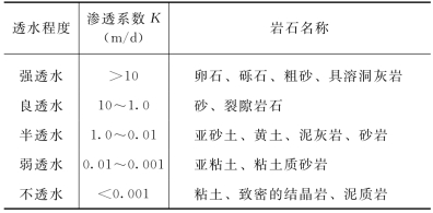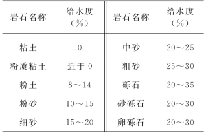岩石的给水度在数值上等于容水度减去持水度。粗粒松散岩石及具有张开裂隙与溶隙的岩石,持水度很小,给水度接近于容水度。粘土以及具微裂隙的岩石,持水度接近于容水度,给水度很小或等于零。给水度是重要的水文地质参数,表1-5为一些常见的松散岩石的给水度。