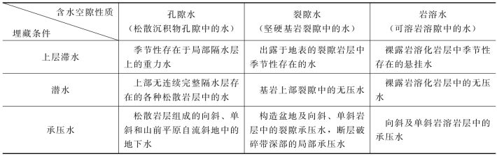 地下水按埋藏条件分为上层滞水、潜水和承压水;按含水介质(空隙)类型分为孔隙水、裂隙水和岩溶水。