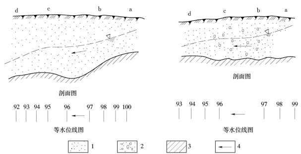 1—砂;2—砾石;3—隔水层;4—潜水流向