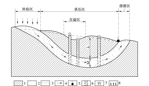 1—隔水层;2—含水层;3—地下水位;4—地下水流向;5—泉(上升泉);6—钻孔,虚线为进水部分;7—自流孔;8—大气降水补给;h—承压水头;M—含水层厚度