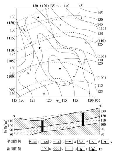 1—地形等高线(m);2—含水层顶板等高线(m);3—等水压线(m);4—地下水流向;5—承压水自溢区;6—钻孔;7—自流井;8—含水层;9—隔水层;10—承压水位线;11—钻孔;12—自流井