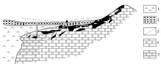 1—闪长岩及辉长岩;2—胶结较好的砾石;3—地下水位;4—奥陶纪白云质灰岩;5—大理岩