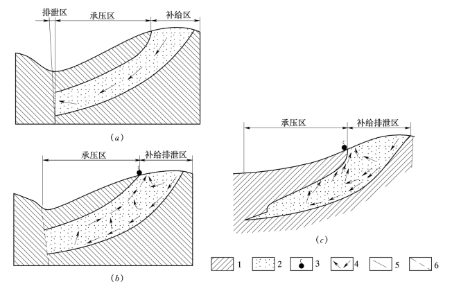 1—隔水层;2—含水层;3—泉;4—地下水流向;5—导水断层;6—隔水断层