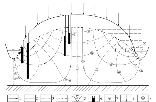 1—流线;2—等水头线;3—分流线;4—潜水面;5—河水位;6—井,涂黑部分有水;7—代表矿化度大小的符号,图圈愈多,矿化度愈大;8—降水入渗;9—绘制流网的大致顺序