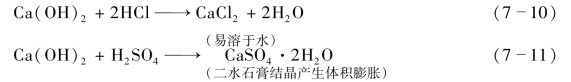 硅酸盐水泥硬化后生成大量的碱性水化物Ca(OH)2,在酸的作用下中和生成盐,这些盐或易溶于水,或体积膨胀,使混凝土受到不同程度的破坏,如