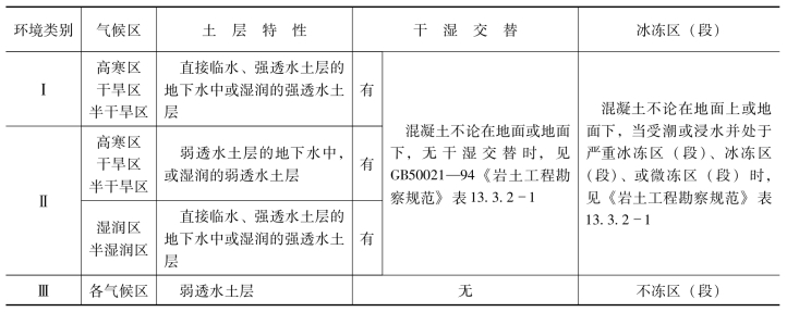 建筑场地根据气候区、土层透水性、干湿交替和冻融交替情况区分为3类环境,在这3类环境中,同一盐类浓度对混凝土腐蚀性的强弱是不同的。例如,在Ⅰ类环境中腐蚀十分强烈;在Ⅱ类环境中腐蚀性明显减弱;在Ⅲ类环境中腐蚀性可能是微弱腐蚀或无腐蚀。腐蚀的环境分类列入表8-3内。