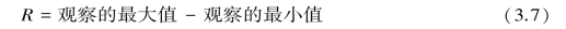 极差是变量的取值范围,是配合中位数或平均值说明数据离散程度的统计特征值,是对定序以上变量离散程度的度量。 极差一般用R 表示,其公式为: