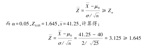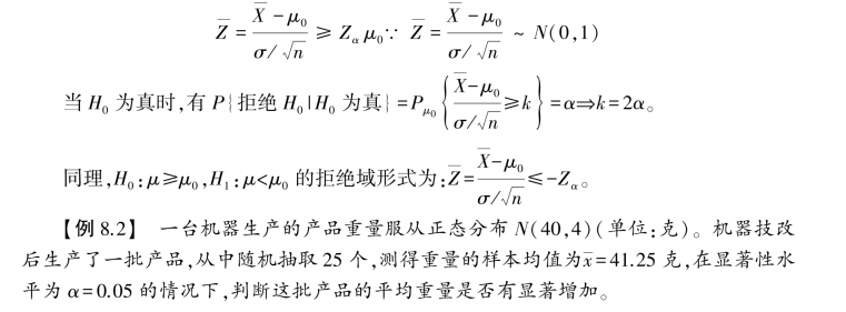 即样本均值落在拒绝域内,从而拒绝H0,接受H1。 认为这批产品的平均重量有显著增加。