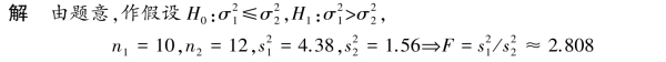 =1.56。 在显著性水平为α=0.05 的情况下,判断两个工厂产品寿命的方差大小。
