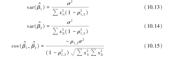 以两个自变量的多元回归模型为例,在使用最小二乘法(OLS)去估计待估计参数时,估计量的方差与协方差公式如下: