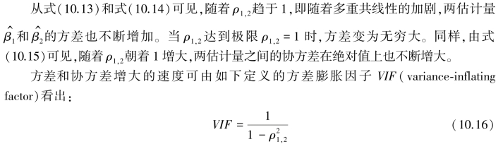 VIF 表明,估计量的方差由于多重共线性的出现而膨胀,随着ρ1,2趋于1,VIF 趋于无穷大,即随着共线性程度的增加,估计量的方差也增加,并且在多重共线性达到极限ρ1,2 =1 时,它可以变到无穷大。 还容易看到,如果X1 与X2 之间无共线性,VIF 将是1。
