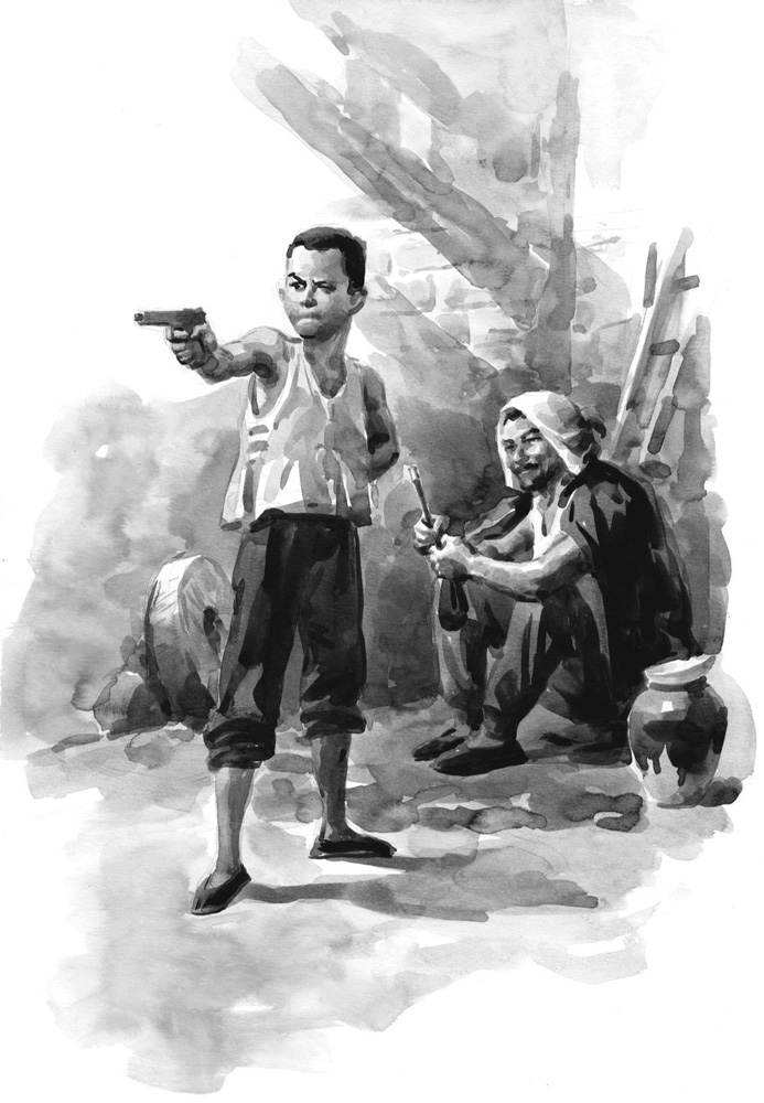 小门推开了,屋子里一片昏黑,只从窗户上的坯缝儿里漏进几道光来。老钟叔正坐在烂草上,“凿壁偷光”似的就着一道亮儿在弄一件什么东西。小嘎子近前一看,乐得跳起高儿来了,原来老钟叔削成了一把木头手枪。