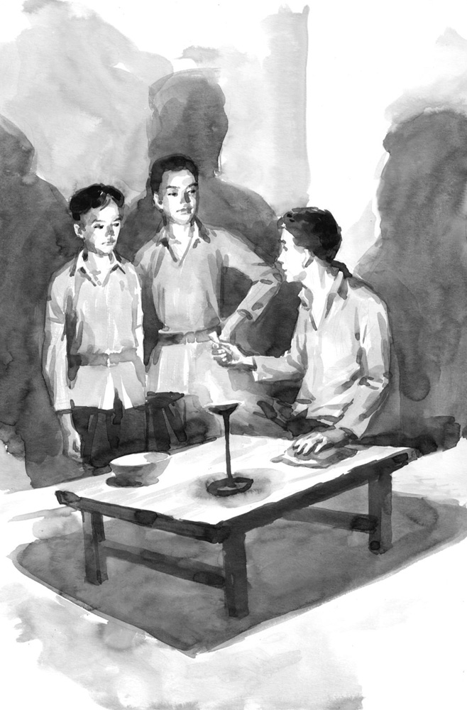 老刘笑了。他说他还有些工作要安排,今夜还得跑两三个村子。而且,人多目标大,搭伙多了不灵便。他鼓励三个孩子尽管先行一步:“紧急时期,得敢独立行动,天下没有过不去的火焰山。”他见两个孩子仍然为难,便从小包袱里抽出钢笔,撕块窗户纸在上头画了几画,递给轴子说,“可以先去边家渡,找找这个人,请他照顾你们北上。就说是老刘叫找他的。”