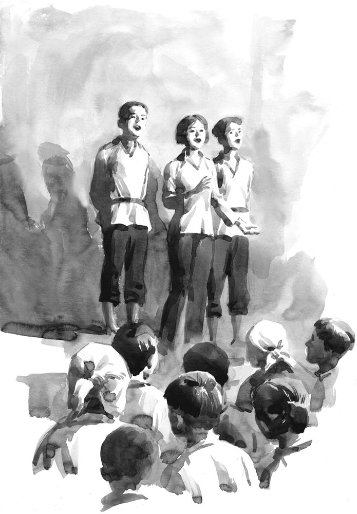 三个孩子盛情难却,只好又挺起胸脯,背过手去,笑眯眯地等待着,等待着亲爱的老乡们稍稍静下一点儿来……