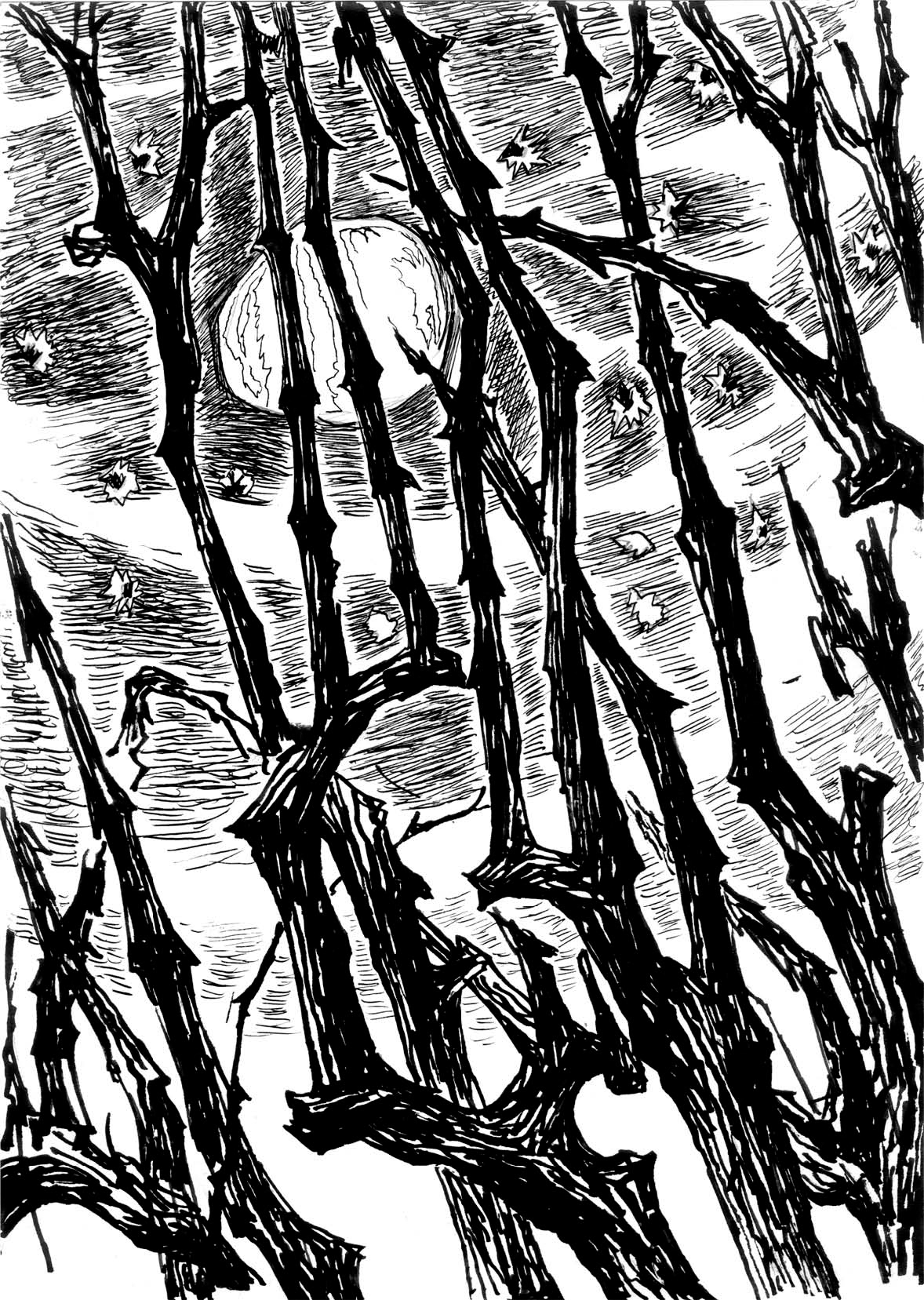 枣树……默默地铁似的直刺着奇怪而高的天空……使月亮窘得发白。