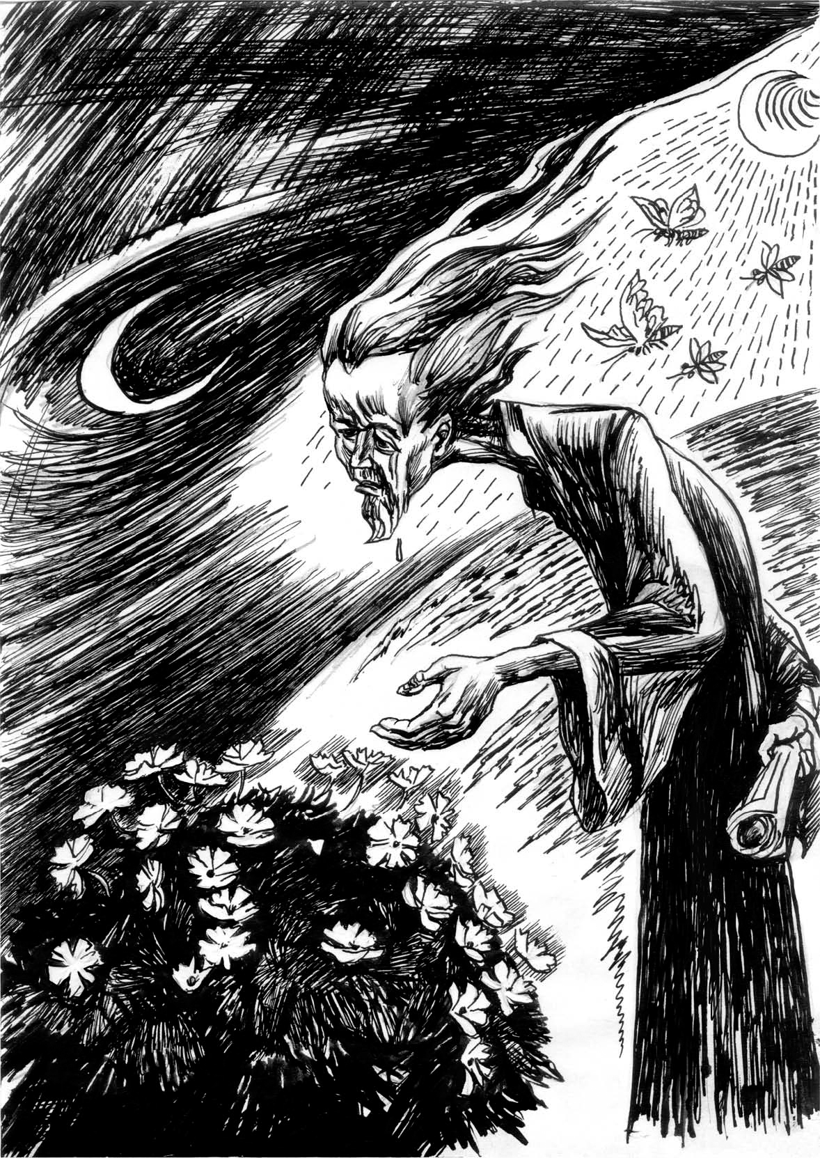 着几十个星星的眼,冷眼。他的口角上现出微笑,似乎自以为大有深意,而将繁霜洒在我的园里的野花草上。