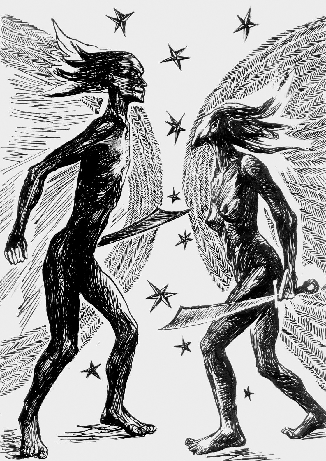 然而他们俩对立着,在广漠的旷野之上,裸着全身,捏着利刃,然而也不拥抱,也不杀戮,而且也不见有拥抱或杀戮之意。