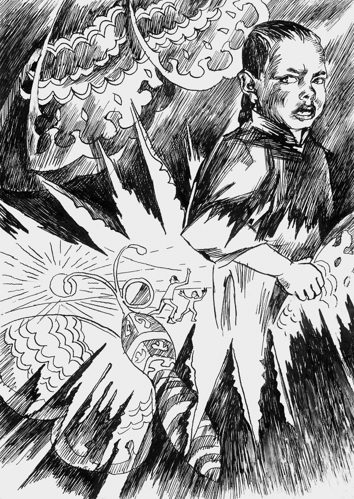 有一天,我忽然想起,似乎多日不很看见他了,但记得曾见他在后园拾枯竹。我恍然大悟似的,便跑向少有人去的一间堆积杂物的小屋去,推开门,果然就在尘封的什物堆中发见了他。他向着大方凳,坐在小凳上;便很惊惶地站了起来,失了色瑟缩着。大方凳旁靠着一个胡蝶风筝的竹骨,还没有糊上纸,凳上是一对做眼睛用的小风轮,正用红纸条装饰着,将要完工了。我在破获秘密的满足中,又很愤怒他的瞒了我的眼睛,这样苦心孤诣地来偷做没出息孩子的玩艺。我即刻伸手折断了胡蝶的一支翅骨,又将风轮掷在地下,踏扁了。论长幼,论力气,他是都敌不过我的,我当然得到完全的胜利,于是傲然走出,留他绝望地站在小屋里。后来他怎样,我不知道,也没有留心。