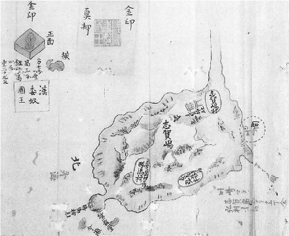 志贺岛上发现金印,引起了福冈著名儒学家龟井南冥的极大兴趣,他一方面呼吁官方保护,同时,根据甚兵卫的描述绘出了“志贺岛叶崎村金印出土图”。此图上方为西,那条“尾巴”是通往省府福冈的长堤;图左为北,注有“外海”,通往朝鲜半岛;图右为南,是博多湾;志贺岛的南北两端绘有两个历史悠久的神社。特别值得注意的是图的左上角,作者盖上了金印“真押”,绘出了俯视图和侧视图,并标注出尺寸和重量。这是志贺岛金印最初的考古记录(图2.4)。