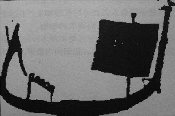 图3.1 埃及出土的约制作于公元前3100年的陶罐上,绘有一条风帆船,船的首尾两端高高翘起,桅杆上挂着一张四方形单横帆。