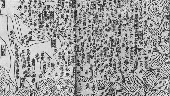 图3.3 《古今华夷区域总要图》(局部)绘出并标注了“扶南”。此图除诸岛的面积不准确以外,大陆与岛屿也分不清,如扶南就被绘成岛国、地理位置也相差很远。