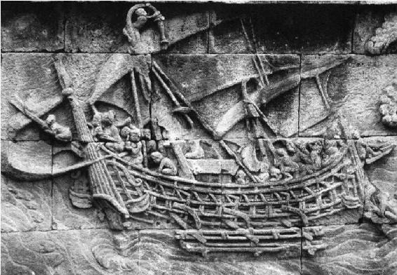图3.6 印尼爪哇岛婆罗浮屠佛教遗址里有千余幅浮雕画,其中有一幅帆船浮雕,留下了8世纪的活跃在南洋的商船形象。