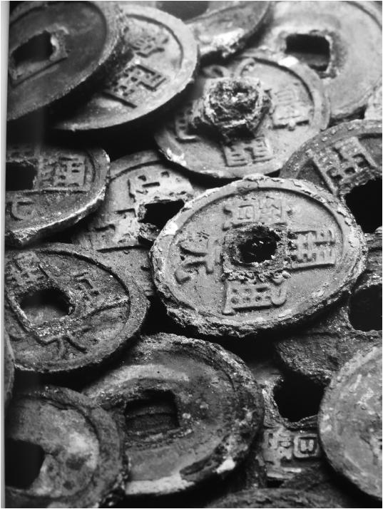 图6.5 “黑石号”出土的唐代开元通宝铜钱,中国币制脱离以重量为名的铢两体系,发展为通宝币制,成为唐以后历朝铸币标准沿袭近1300年。