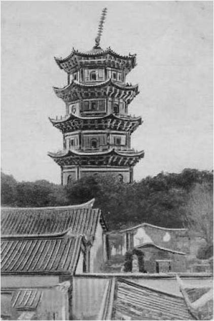 走进开元寺的大院内,我先看的是院内相距约200米的两座古塔。东塔名为“镇国塔”,建于咸通六年(865年),当初为五层木塔,后改为石塔。西塔名为“仁寿塔”,建于五代梁贞明三年(917年),当初也是五层木塔,后几经毁坏,改建为砖塔。东塔通高48米,西塔高44米。如此高塔,立在泉州湾的晋江东岸,在古代,它们已不仅仅是佛塔,还兼具泉州湾地标和航标的功能,给出海船归港船只以指引。我恰是在这个意义上,来到塔下驻足仰望。据史料载,明万历三十二年(1604年)泉州曾发生八级大地震,而双塔无损,仅“镇国塔”顶盖石角折宝刹倾斜,在清末厦门美璋照相馆出版的“镇国塔”明信片上,还可见到这一奇景(图6.7)。