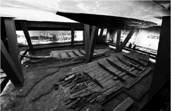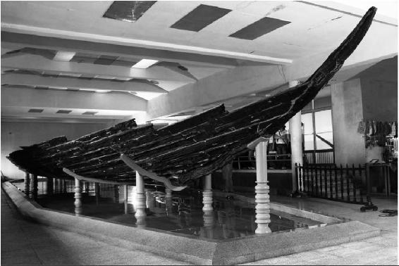 图6.11 蓬莱古船博物馆展示的元明时期古沉船,2号古船残长22.5米,复原尺寸35米,为目前中国发现的同时期最大的明战船。