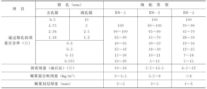 2.ES—1型适用于较大裂缝的封缝或中、轻交通道路的薄层罩面处理;ES—2型是铺筑中等粗糙度磨耗层最常用的级配,也可适用于旧路修复罩面;ES—3型适用于高速公路、一级公路和城市快速路、主干路的表层抗滑处理,铺筑高粗糙度的磨耗层。