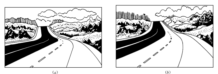 (a)不设缓和曲线感觉路线扭曲;(b)设置缓和曲线后变得平顺美观