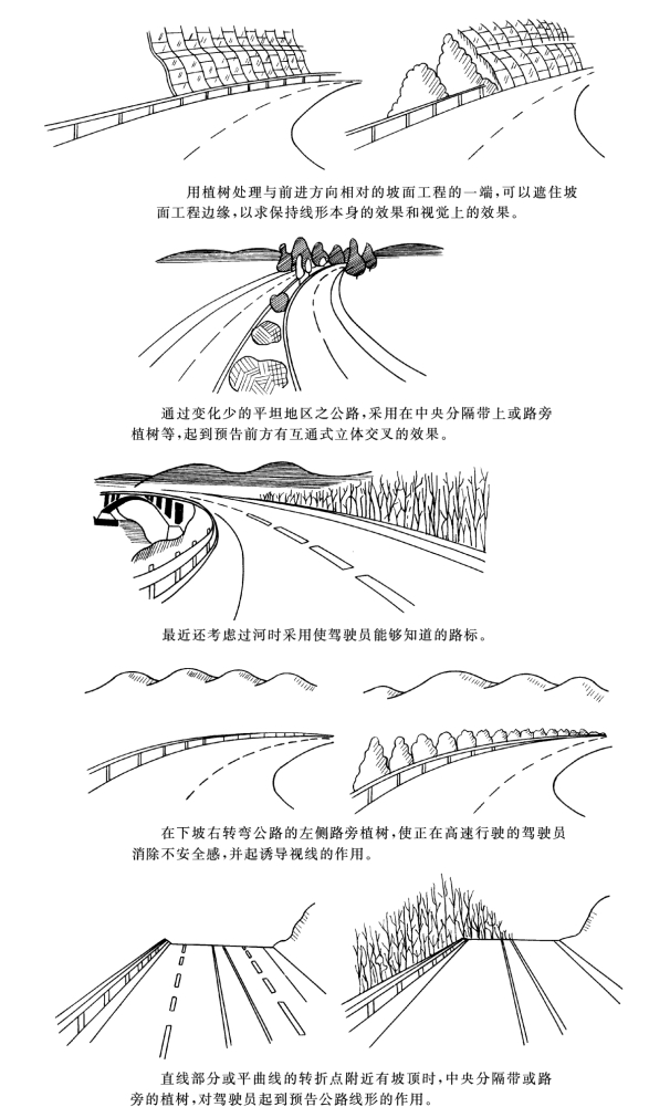 (3)应能提供视野的多样性,力求与周围的风景自然地融为一体。充分利用自然风景如孤山、湖泊、大树等,或人工建筑物如水坝、桥梁、高烟囱、农舍等,或在路旁设置一些设施,以消除单调感,并使道路与自然密切结合。
