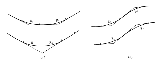 相邻反向竖曲线之间,为使增重与减重之间和缓过渡,中间最好插入一段直线。若两竖曲线半径接近极限值时,这段直坡段至少应为计算行车速度的3s行程。当半径比较大时宜可直接相连。如图5-23(b)所示。