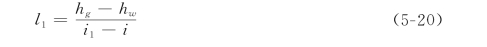 锯齿形街沟的设计主要是确定分水点和雨水口的位置即街沟纵坡变坡点之间的距离,以便布置雨水口。如图5-31所示,设相邻雨水口间距为l,分水点至雨水口的距离分别为l1和l-l1;雨水口处缘石外露高度为hg,分水点处缘石外露高度为hw;缘石顶线纵坡(一般等于路中线纵坡)为i,左、右街沟底纵坡分别为i1和i2