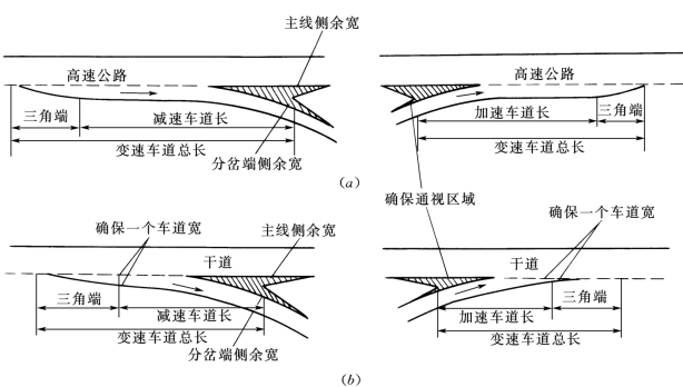 变速车道有定向式和平行式两种,如图12-2所示。当高速公路与匝道的车速相差较大时,需设置平行式车道;当两计算车速相差不大时,宜采用缓和曲线连接或设置定向式变速车道。