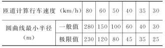 由于匝道既有弯道又有坡度,行车条件较差,且受地形限制,平曲线半径较小,故其计算行车速度只能取相交道路计算车速的50%~70%;其最大纵坡亦不宜大于5%;其最小半径则可参考表12-6所列数值。