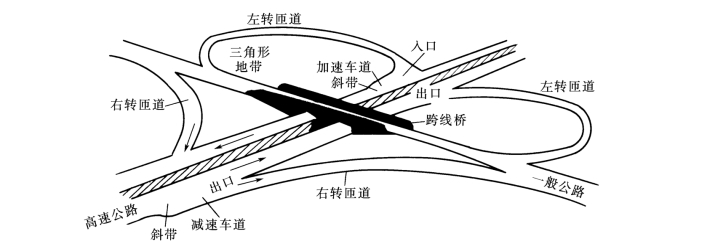 立体交叉的交通组织方式不同,其组成部分也有所不同。互通式立体交叉的主要组成,如图12-1所示。