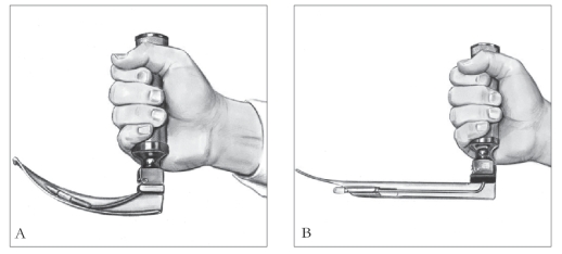 注:A.镜片为弯的喉镜;B.镜片为直的喉镜。