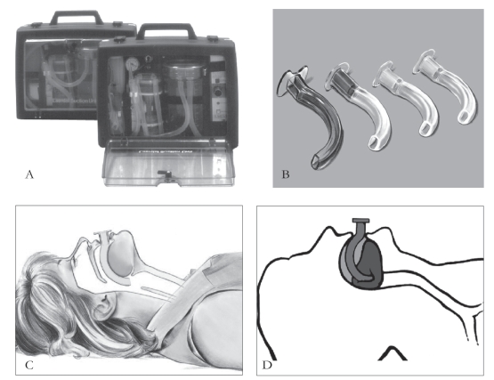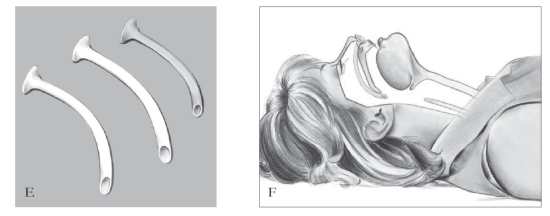 注:A.脚踏式吸引器;B.各种型号的口咽管;C.规格适中的口咽管放置后开放气道;D.如口咽管太短则反而会把舌根往后推而更加阻塞气道;E.各种型号鼻咽管;F.鼻咽管放置后开放气道。