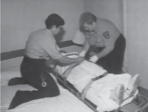 图2-101 腹腔闭合性损伤伤员用固定带将伤员固定在担架上(广义的固定)
