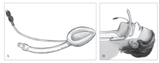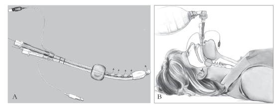 注:A.气管食管联合导管;B.放置气管食管联合导管。
