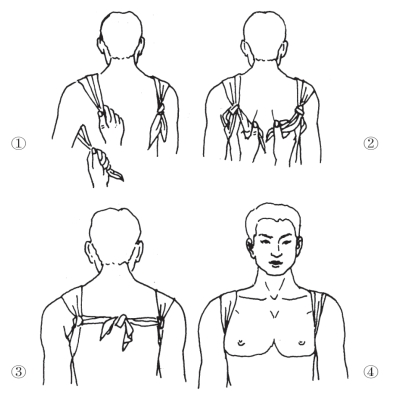 13)三角巾双侧胸背部包扎法:适用于双侧胸背部外伤。
